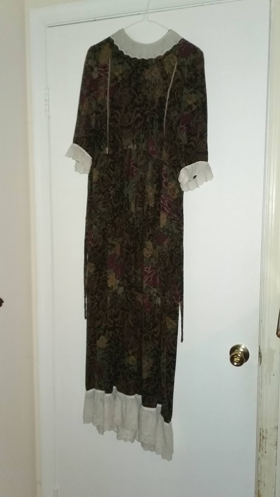 This dress was originally a thrift store purchase. The sleeve and neckline were too tight to be comfortable and the dress was a bit short. So, I cut the high neck off the dress, and the long sleeves down and added the white trim around to add length and character to the dress. It was one of my first pregnancy dresses. After the birth I added nursing zippers and was quite delighted to find that I could still have it be a nice comfortable but elegant dress to wear while nursing.